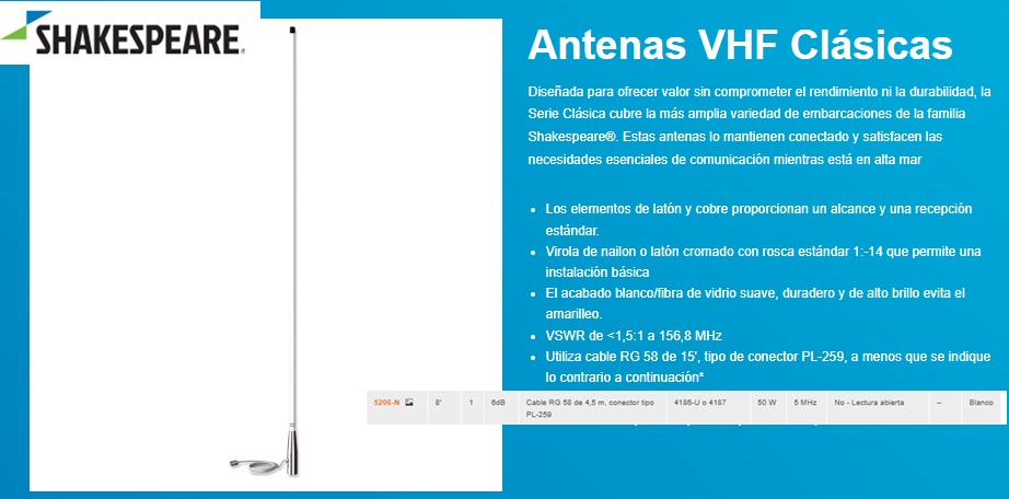- Shakespeare 5206-N Antena Marina Classic VHF Altura 2,44m 1 sección 6dB Cable RG 58 de 4,5m, conector tipo PL-259 50W (A pedido por importación 10-12 semanas) Precio con iva incluido