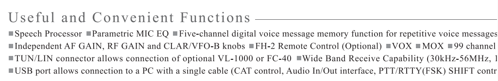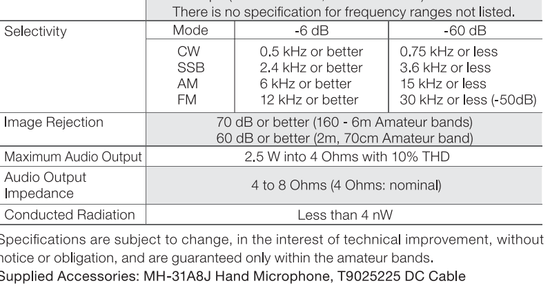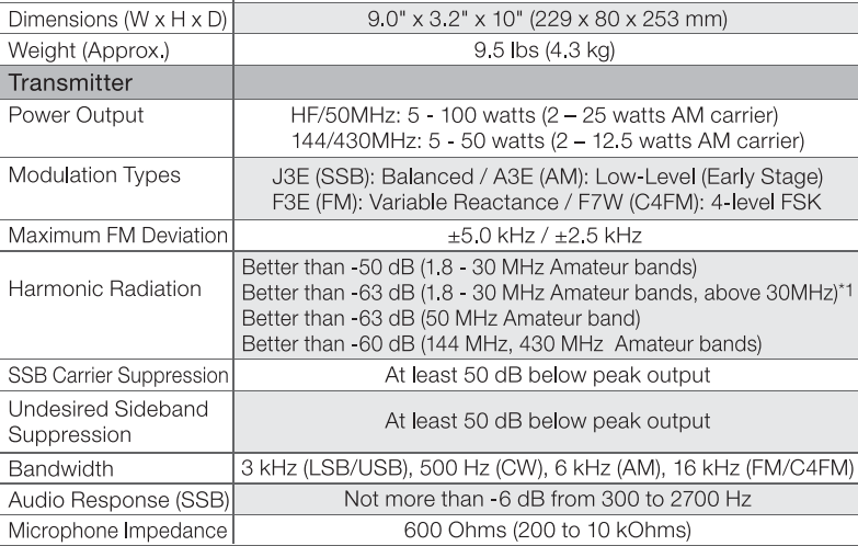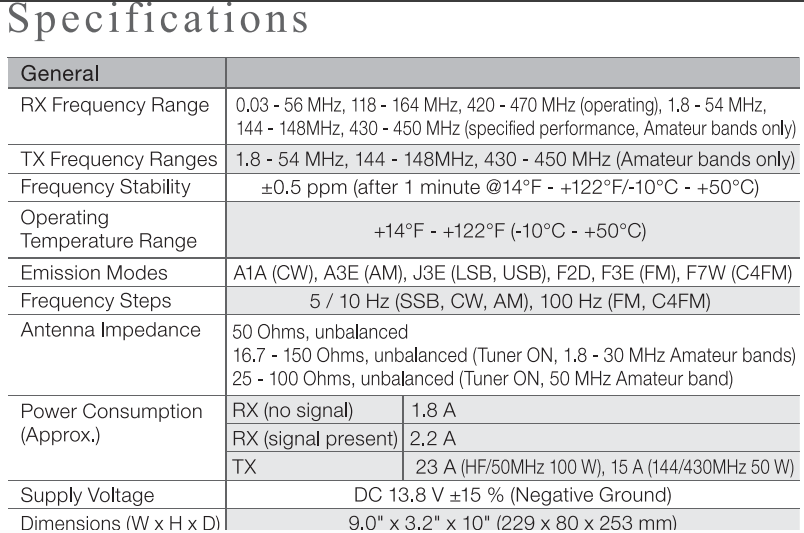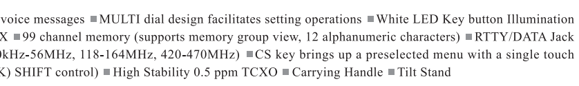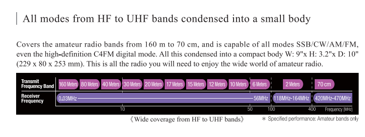 - ¡160 metros y 70 centímetros en una sola radio! Si tiene un espacio limitado para la radio, este es uno de los puntos fuertes de este modelo. Una sola radio con transmisión MF/HF/VHF/UHF con AM/FM/C4FM/USB/LSB/CW/DATA y RTTY es algo prácticamente inaudito.