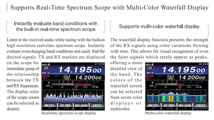El nuevo alcance del espectro dinámico en tiempo real brinda a los operadores de radio la capacidad de ver gráficamente la ubicación de las señales en la banda mientras escuchan el audio recibido, lo que les permite pasar rápidamente a la señal deseada. La intensidad de las señales en la banda se puede ver fácilmente en la pantalla en cascada multicolor. La diferenciación de colores en orden cronológico permite a los operadores reconocer fácilmente señales débiles de un vistazo; señales que de otro modo podrían pasar desapercibidas en el alcance del espectro.