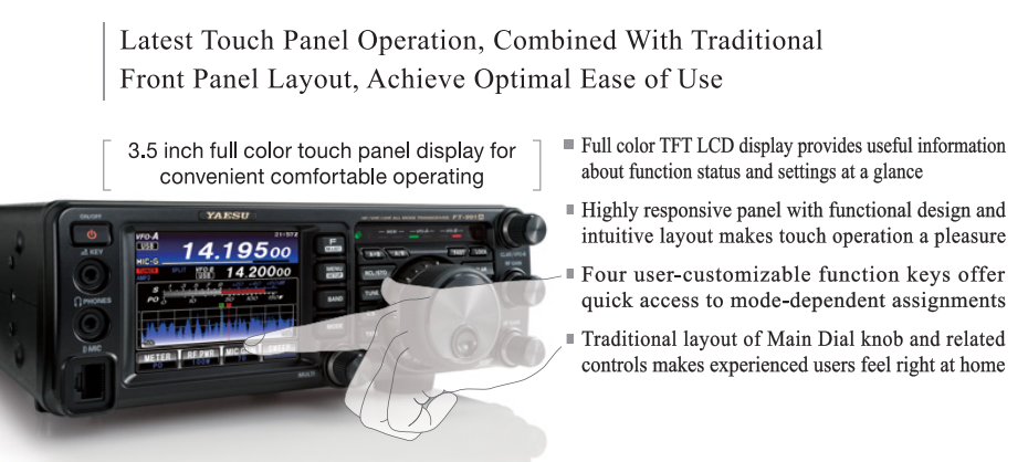 El nuevo FT-991A ahora incluye un panel táctil TFT de 3,5" a todo color y alta resolución para una operatividad y visibilidad superiores, incorporando un espectro de alta velocidad y un osciloscopio en tiempo real de alta resolución con ASC (control automático del osciloscopio de espectro) incorporado.