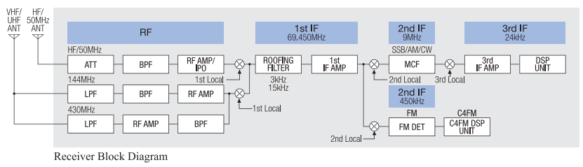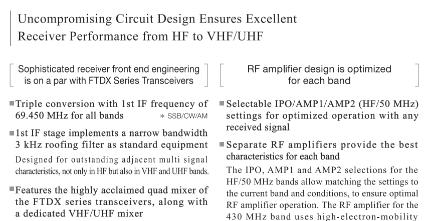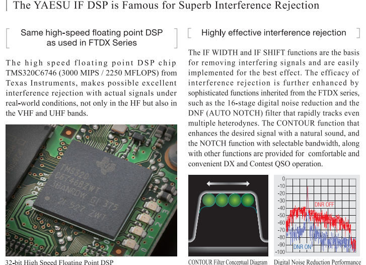 Reconociendo una importante regla de oro para los radioaficionados: "No puedes trabajar con ellos si no puedes oírlos", el FT 991 presenta una configuración de circuito receptor altamente balanceado, resistente y de última generación. El chip DSP de punto flotante de alta velocidad TMS320C6746 (3000 MIPS / 2250 MFLOPS) de Texas Instruments utilizado en el diseño del receptor garantiza un excelente rechazo de interferencias con señales reales en condiciones reales, no solo en HF sino también en las bandas VHF y UHF.