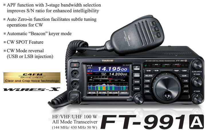 El FT-991A es la próxima generación de transceptores MF/HF/VHF/UHF en todos los modos y todas las bandas con capacidad digital C4FM (System Fusion). El FT-991A incluye operación multimodo en CW, AM, FM, SSB y modos digitales (paquetes, PSK31, RTTY y C4FM), con capacidad de 100 vatios HF/50 mhz (50 vatios VHF/UHF).