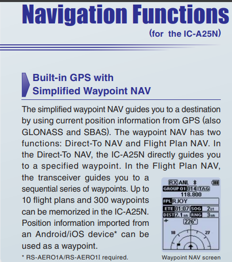 La NAV de waypoint simplificada le guía hasta un destino utilizando la información de posición actual del GPS (también GLONASS y SBAS). El waypoint NAV tiene dos funciones: NAV Directo y NAV Plan de Vuelo. En la NAV directa, el IC-A25N le guía directamente a un waypoint especificado. En el Plan de Vuelo NAV, el transceptor le guía a una serie secuencial de waypoints. Se pueden memorizar hasta 10 planes de vuelo y 300 waypoints en el IC-A25N. La información de posición importada desde un dispositivo Android/iOS* puede utilizarse como waypoint.