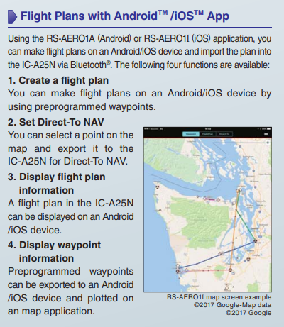 Un plan de vuelo en el IC-A25N se puede mostrar en un dispositivo Android/iOS.