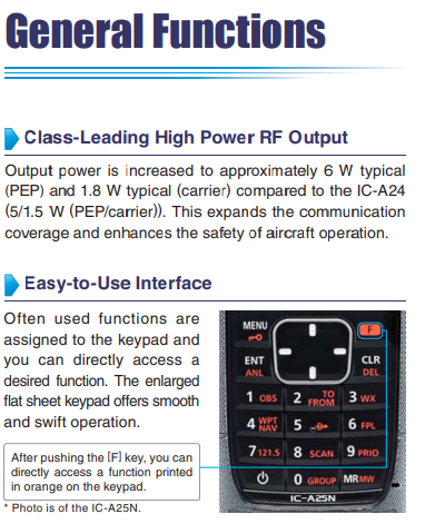 La potencia de salida aumenta hasta aproximadamente 6 W típicos (PEP) y 1,8 W típicos (portadora) en comparación con el IC-A24 (5/1,5 W (PEP/portadora)). Esto amplía la cobertura de las comunicaciones y mejora la seguridad de funcionamiento de las aeronaves.