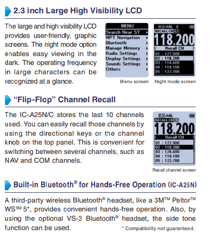 El IC-A25N/C almacena los últimos 10 canales utilizados. Puede recuperar fácilmente esos canales utilizando las teclas direccionales o la perilla de canales en el panel superior. Esto es conveniente para cambiar entre varios canales, como los canales NAV y COM.