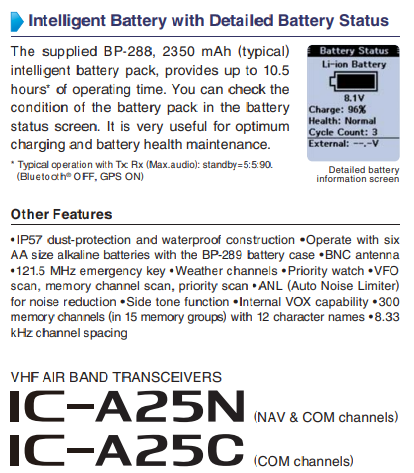 La serie A25 es un potente handheld de banda aérea con 6 vatios de potencia y un grado de impermeabilidad IP57; el tiempo no puede detener estas radios. El dispositivo de mano incluye una gran batería de iones de litio de 2350 mAh, que proporciona un largo tiempo de funcionamiento. La interfaz fácil de usar y la gran pantalla LCD de 2,3 pulgadas se combinan para proporcionar una programación sin estrés y un funcionamiento en vuelo. Bluetooth® integrado, GPS y navegación VOR están disponibles en la versión A25N NAV/COM.