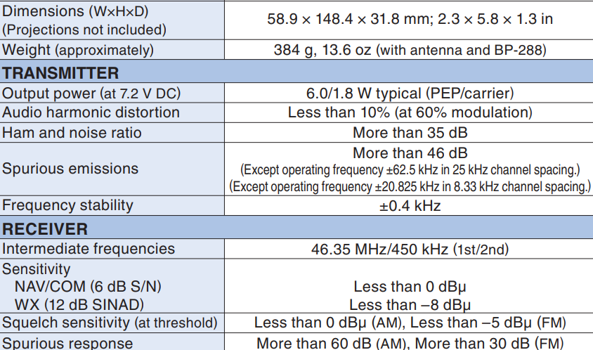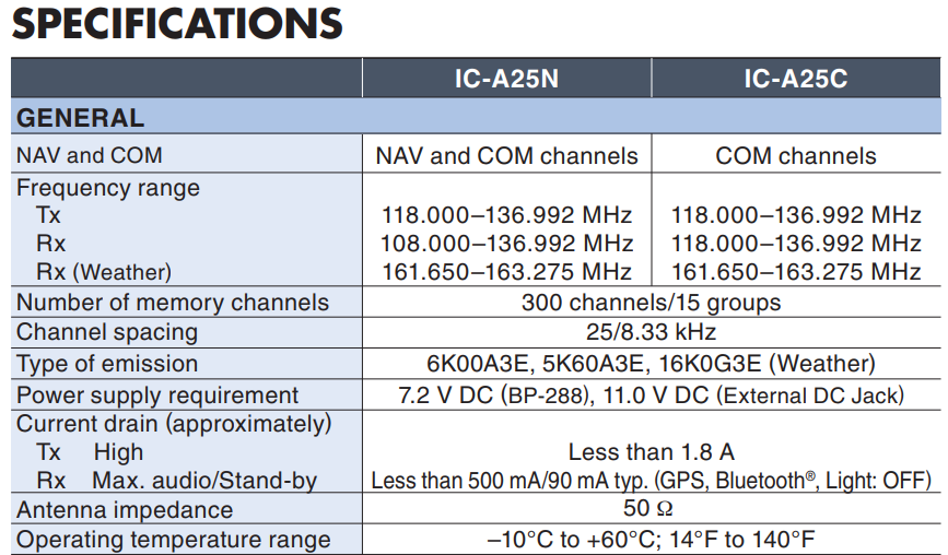 | RX | 108,000-136,992 MHz | 118,000-136,992 MHz | |