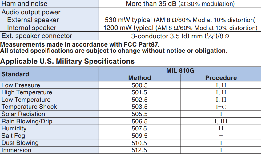 | Emisiones espurias | Más de 46 dB (Excepto frecuencia de funcionamiento ±62,5 kHz en separación de canales de 25 kHz). (Excepto frecuencia de funcionamiento ±20,825 kHz en separación de canales de 8,33 kHz). | |