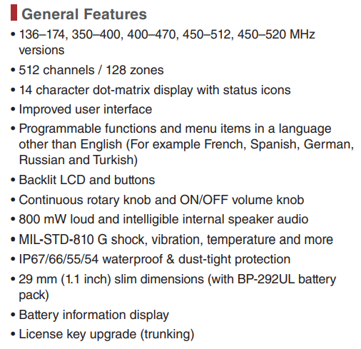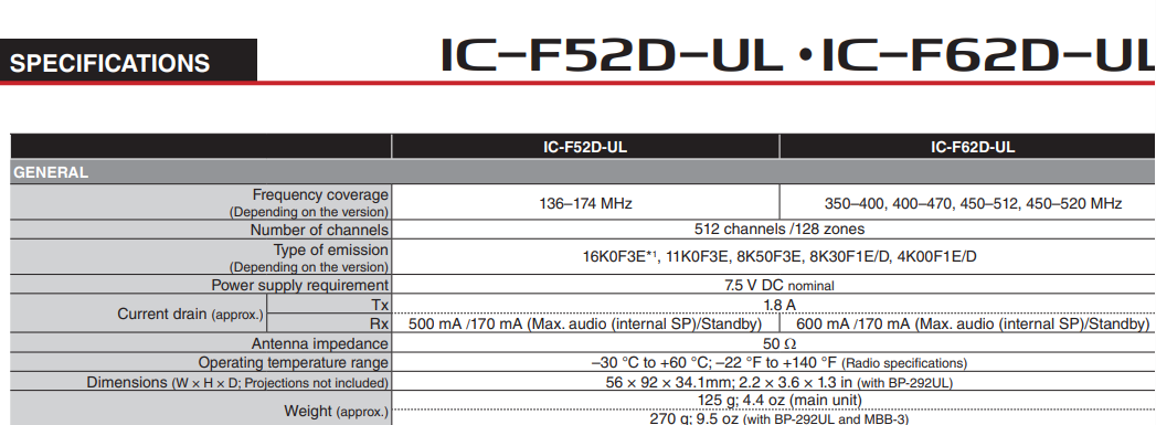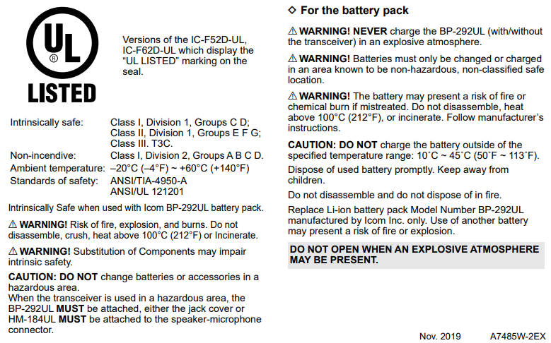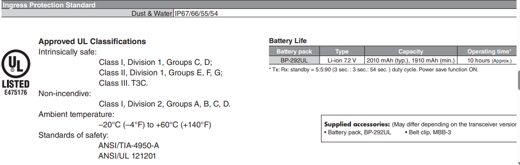 * Intrinsically Safe when used with Icom BP-292UL battery pack.
