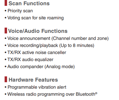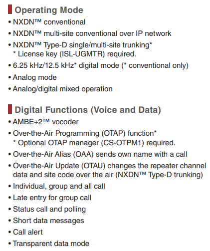 - Trunking dPMR modo 3 (Se requiere clave de licencia, ISL-UGMD3. No disponible en todas las regiones).