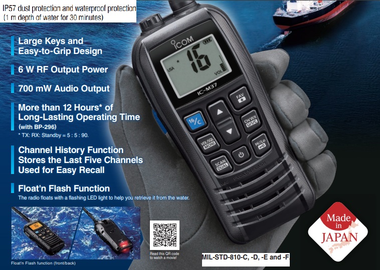 - ICOM IC-M37 6W/1W Radio portátil marino flotante Flash´n float, AQUAQUAKE, IP57, NOAA Alert 12 hours (Importación 4-6 semanas) Precio con iva incluido