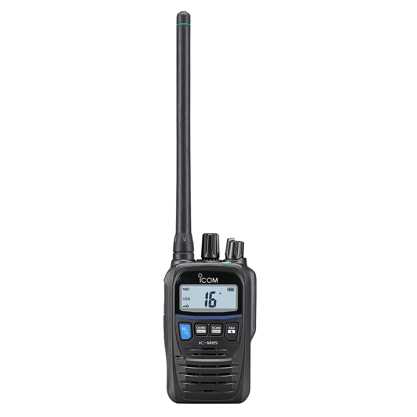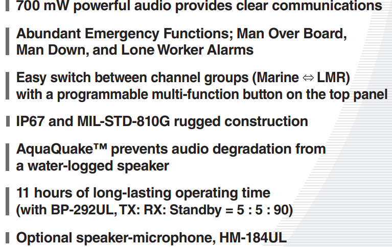 La M85 es la radio más pequeña, ligera y resistente del mercado. El M85 está construido según MIL-STD 810 y puede soportar entornos peligrosos e inhóspitos, tanto en tierra como en el mar. El grado de impermeabilidad IP67 protege la radio incluso si se cae al agua. A los clientes comerciales y de yates les gusta la M85 por los 100 canales móviles terrestres programables, así como por el codificador de voz integrado fácil de usar para comunicaciones privadas. El M85 está repleto de las funciones que necesita, incluida una alarma de emergencia automática.