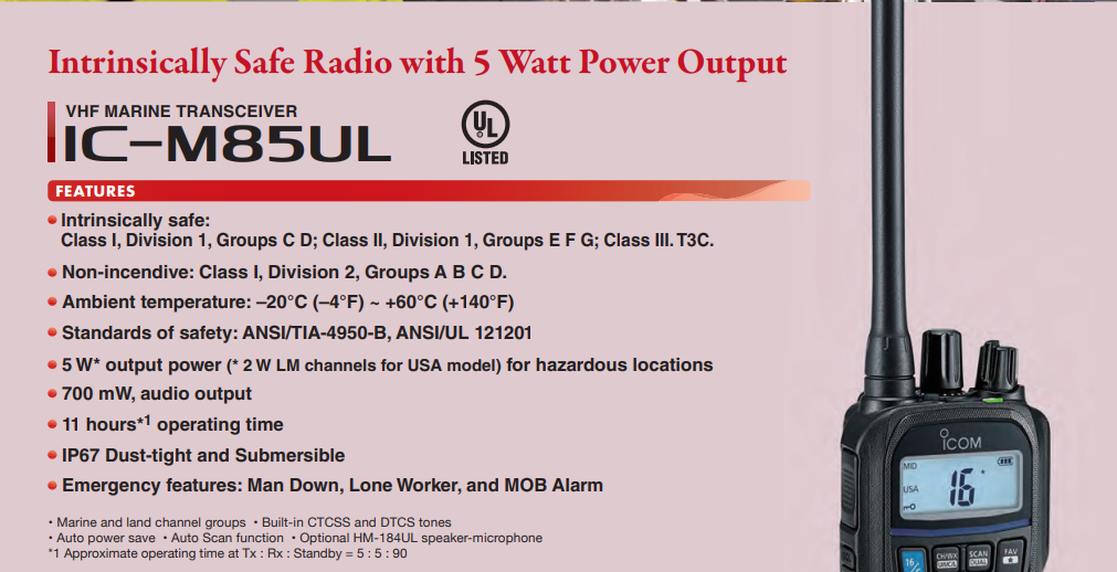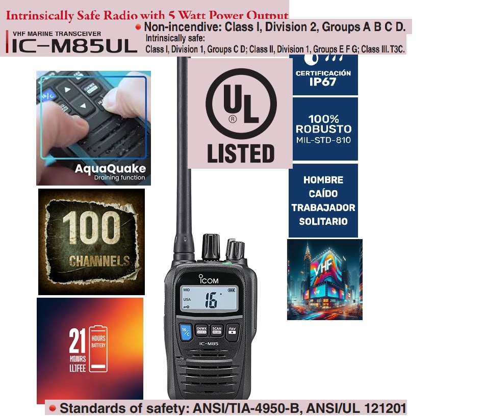 - ICOM IC-M85UL 100CH 5W UL913 Radio portátil terrestre y marina Intrínsicamente Seguro, IP67, MIL-STD-810G, MOB, MAN DOWN, LONE WORKER, AQUAQUAKE (Importación 5 semanas) Precio con iva incluido