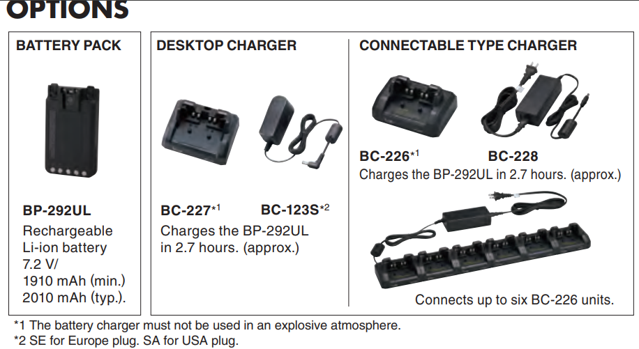 WARNING! NEVER charge the BP-292UL (with/without the transceiver) in an explosive atmosphere.