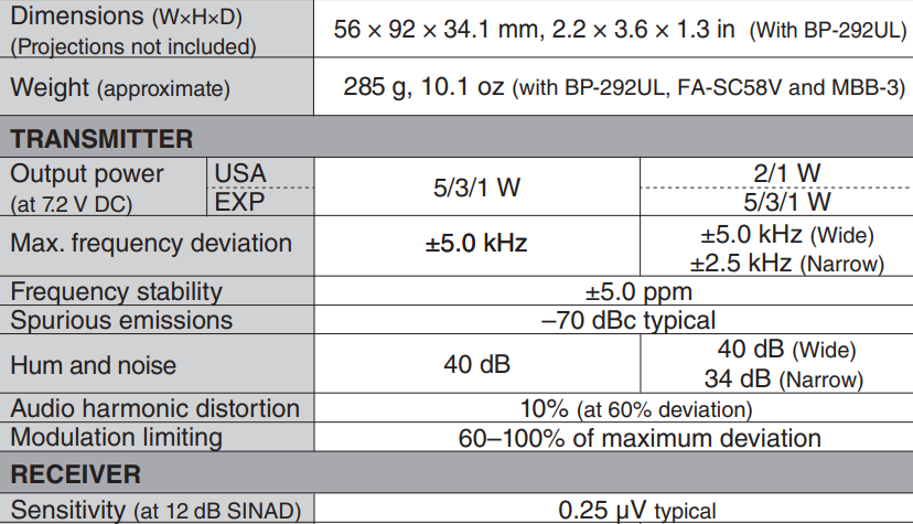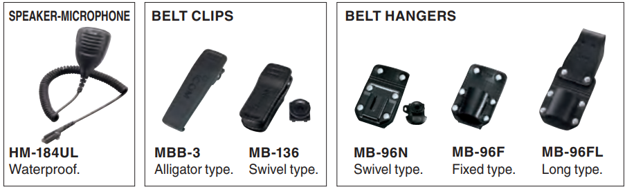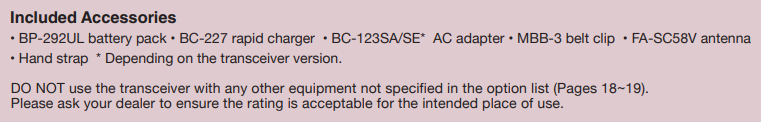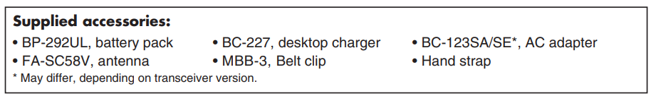 Supplied accessories: • BP-292UL, battery pack • BC-227, desktop charger • BC-123SA/SE*, AC adapter • FA-SC58V, antenna • MBB-3, Belt clip • Hand strap * May differ, depending on transceiver version
