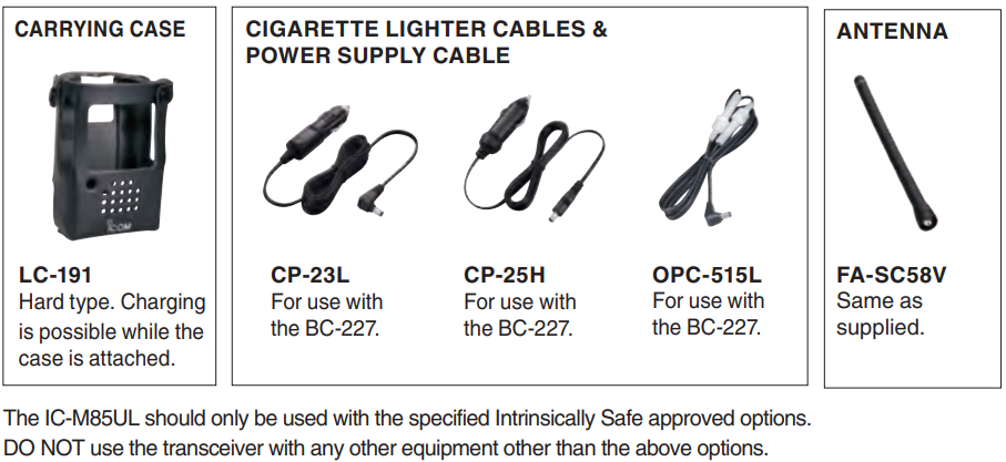 The IC-M85UL should only be used with the specified Intrinsically Safe approved options. DO NOT use the transceiver with any other equipment other than the above options.