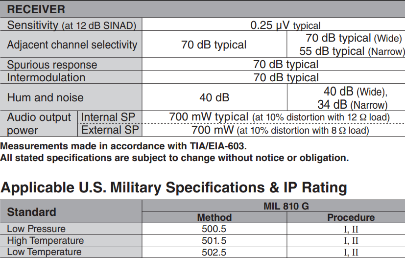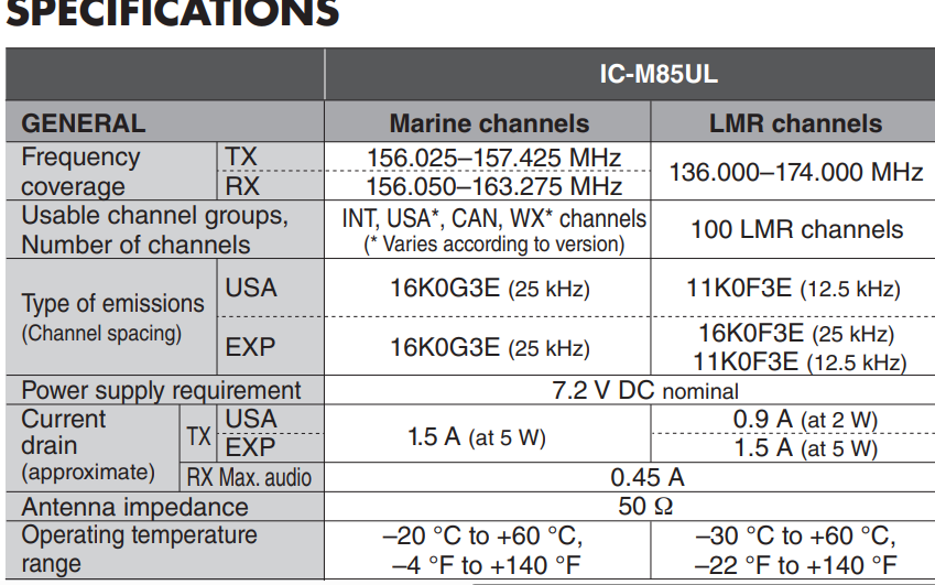 | Tipo de emisiones (Espaciado entre canales) | EE.UU. | 16K0G3E (25 kHz) | 11K0F3E (12,5 kHz) | |
