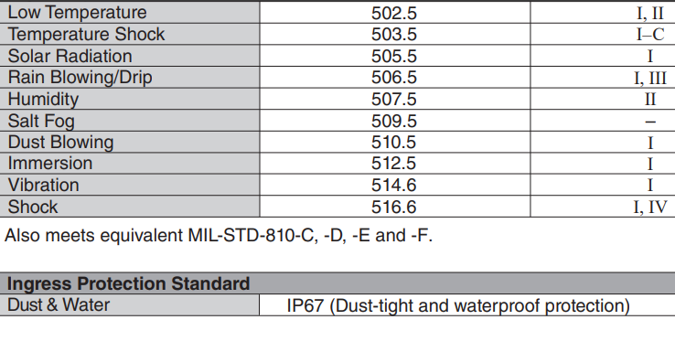 También cumple con el equivalente MIL-STD-810-C, -D -E y -F.