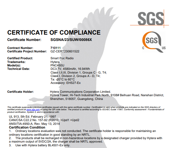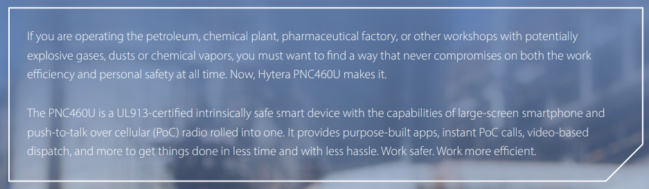 Hytera PNC460 UL913 Smartphone Intrínseco Class I, II, III; Division 1; Groups A–G; T4 and -20°C to +60°C d for hazardous locations with potentially explosive gas and combustible dust Precio con iva