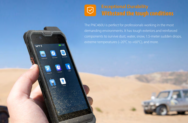 El PNC460 es perfecto para profesionales que trabajan en los entornos más exigentes. Tiene clasificación IP68. El dispositivo tiene exteriores resistentes y componentes reforzados para sobrevivir polvo, agua, nieve, caídas bruscas de 1,5 metros, temperaturas extremas (–20 °C a +60 °C), y más.