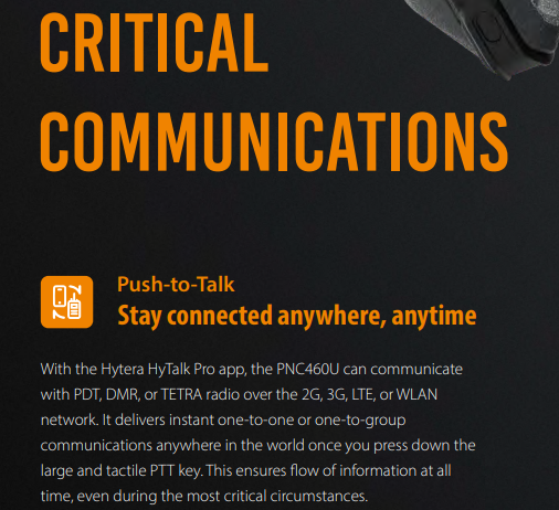 Con la aplicación Hytera HyTalk Pro, el PNC460 puede comunicarse con PDT, DMR o TETRA radios a través de la red 2G, 3G, LTE o WLAN. Ofrece uno a uno instantáneo o uno a grupo comunicaciones en cualquier parte del mundo una vez que presione el PTT táctil y grande .key. Esto garantiza el flujo de información en todo momento, incluso durante las circunstancias más críticas.
