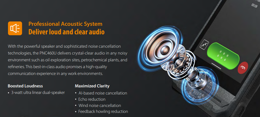 Con el potente altavoz y las sofisticadas tecnologías de cancelación de ruido, el PNC460 Ofrece un audio nítido en cualquier entorno ruidoso, como el mantenimiento eléctrico campo, puerto y fábrica. Este audio de primera clase promete una comunicación de alta calidad Experiencia en cualquier entorno de trabajo.