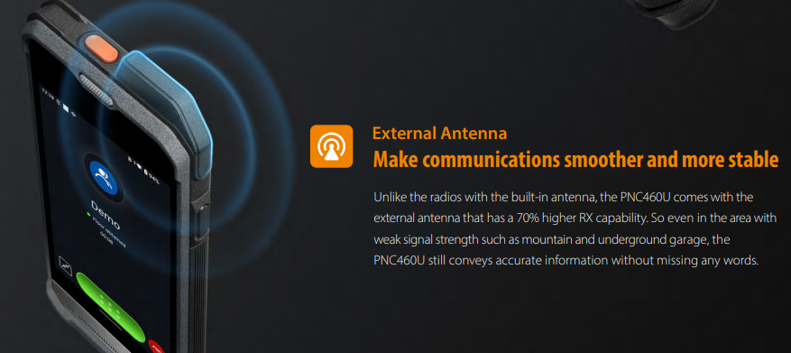 A diferencia de las radios con la antena incorporada, el PNC460 viene con la antena externa que tiene una capacidad RX 70% más alta. Por lo tanto, incluso en áreas con una intensidad de señal débil, como como montañas o garajes subterráneos, el PNC460 aún transmite información precisa sin perder ninguna palabra.