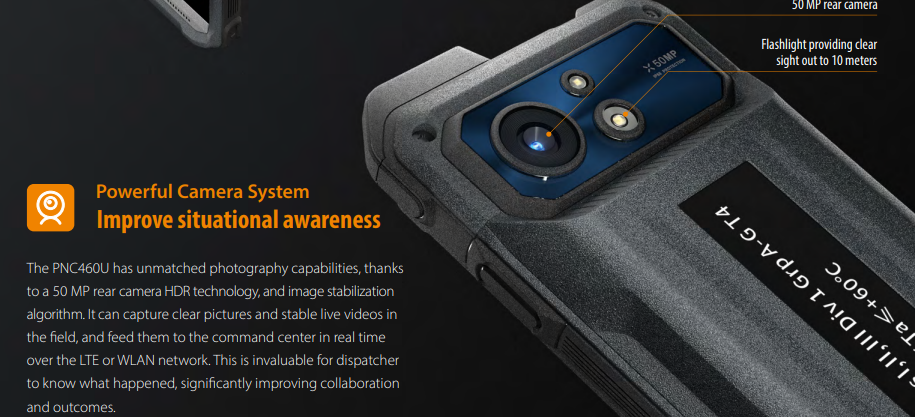 El PNC460 tiene potentes capacidades de fotografía, gracias a una cámara trasera de 50 MP, HDR tecnología y algoritmo de estabilización de imagen. Puede capturar imágenes claras y estables Videos en vivo en el campo, y alimentarlos al centro de comando en tiempo real a través del Red LTE o WLAN. Esto es invaluable para que los despachadores sepan lo que sucedió, significativamente. mejorar la colaboración y los resultados.