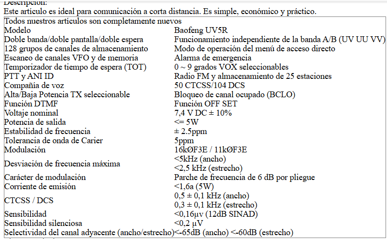 - Baofeng UV-5R 3800mAh UHF 400-520 Mhz/VHF 136-174 Mhz 128CH Analogica 8W Radio dual band Precio con iva incluido