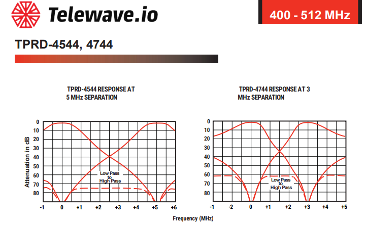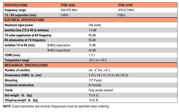 TPRD-4544/4744 duplexers mount on a 19” standard rack, with panel height of 5.25”. Power handling is 250 watts. Receiver desense protection is at least 90 dB, and TX sideband suppression is at least 75 dB.