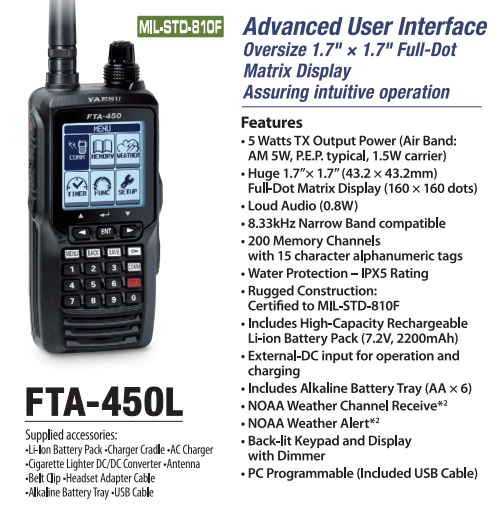 YAESU FTA-450L 200CH Radio para pilotos VOR Navigation Display, MIL-STD-810F, IPX5, NOAA Weather alert, E20, Loud Audio (800mW) Precio con iva incluido