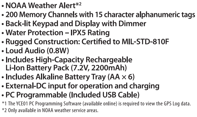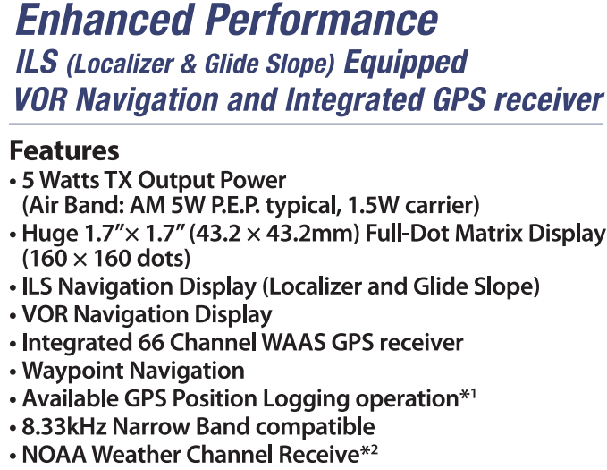 Ahora cumple con MIL-STD-810F Probado y cumple con el estándar militar MIL-STD-810F. Al igual que las radios terrestres comerciales, todos los transceptores Airband actuales de Yaesu han sido probados para determinar su durabilidad contra bajas temperaturas, altas temperaturas, golpes, vibraciones, polvo y lluvia, lo que garantiza muchos años de uso resistente. Receptor GPS WAAS integrado de 66 canales Cuenta con un receptor GPS WAAS integrado de 66 canales que brinda la capacidad de almacenar rápidamente información de posición actual, así como ingresar manualmente puntos de referencia para una navegación confiable. Cuando se activa un waypoint, la pantalla de navegación presenta una brújula con información de rumbo, rumbo sobre el terreno, distancia y velocidad. Operación de registro de posición GPS Incluye una función de registro GPS cuando se activa y almacena automáticamente la información de su posición a intervalos preestablecidos. Esta es una gran característica cuando es necesario retroceder. ILS (Localizador y senda de planeo) y navegación VOR Cuando recibe una señal VOR, la pantalla cambiará automáticamente a la pantalla de banda de navegación, con CDI (indicador de desviación de rumbo) basado en la señal VOR recibida. Sistema de menú fácil de operar Viene configurado con un sistema de menú basado en iconos fácil de operar. Las pantallas y la configuración del menú están configuradas lógicamente para una interfaz de usuario más intuitiva. Enorme pantalla LCD de matriz de puntos Cuenta con una enorme pantalla LCD de matriz de puntos de 1,7" x 1,7" con retroiluminación completa y atenuador. La pantalla de alta resolución facilita la visualización de todas las excelentes funciones que ofrece. Banco de memoria de 200 canales Puede almacenar hasta 200 canales de memoria para una recuperación rápida y sencilla. Con la capacidad de utilizar hasta 15 caracteres alfanuméricos por nombre, permite una mejor descripción del canal. Programable por PC Las configuraciones de canales se pueden reprogramar fácilmente utilizando el cable de programación USB suministrado y el software de programación YCE01 opcional. |